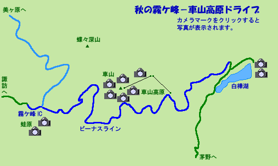 バスはビーナスラインを白樺湖方面に進む。ビーナスラインからは展望が良く、天候にも恵まれて八ヶ岳の向こうに富士山を見ながら緩やかに下って行く。間もなく車山高原に到着。